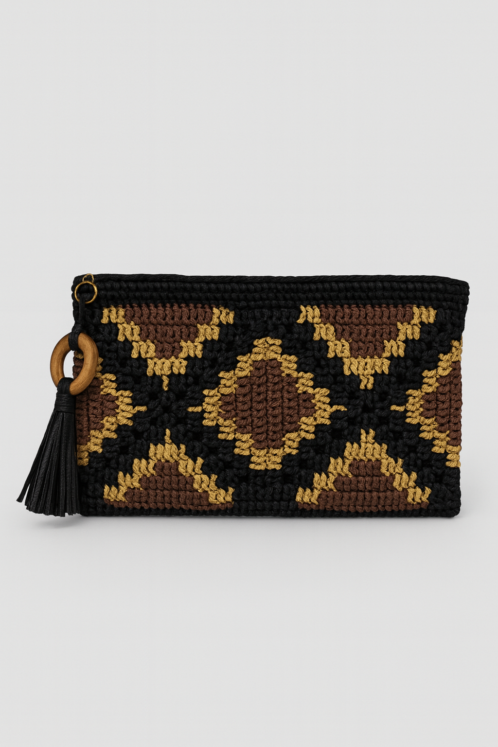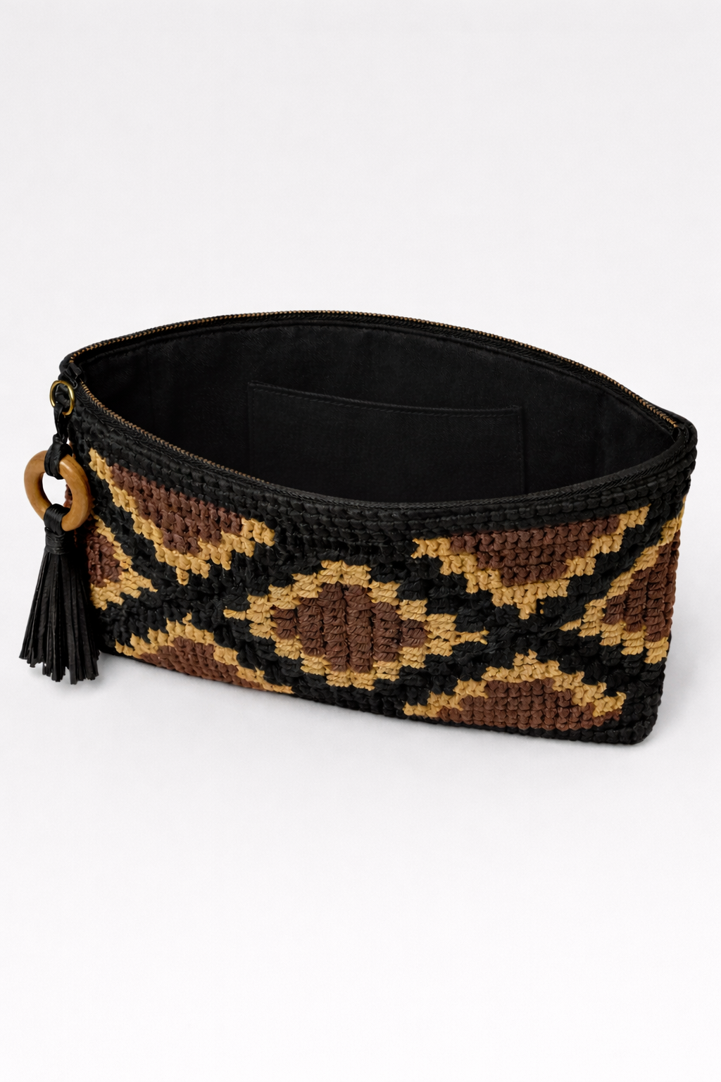 Anadolu Clutch, el işçiliğiyle örülmüş geometrik desenleriyle geleneksel zarafeti modern bir stille buluşturur. Kahverengi, siyah ve hardal tonlarının uyumu; doğadan ve Anadolu’nun zengin kültürel dokusundan ilham alır. El yapımı püskül detayıyla dikkat çeken bu clutch, sade kombinlere karakter, şık akşam stillerine ise özgün bir dokunuş katar.