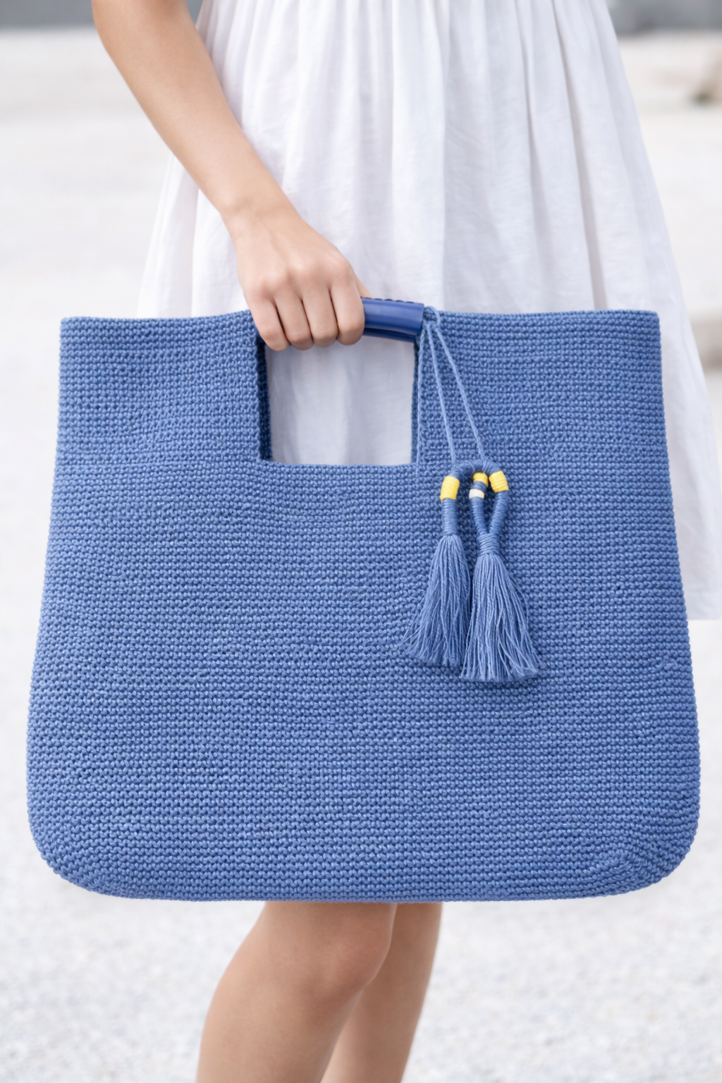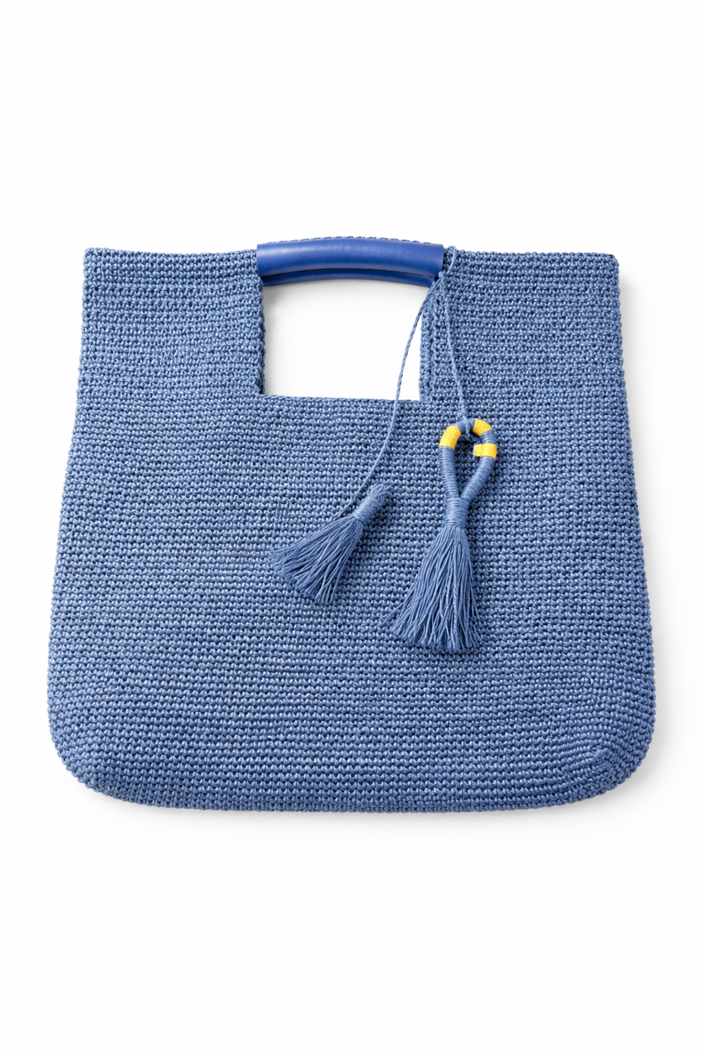 Büyük Püsküllü El Örgüsü Çanta – Sade Bohem Şıklık - Mavi
