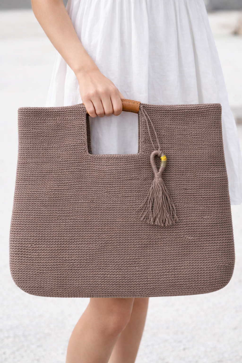 Büyük Püsküllü El Örgüsü Çanta – Sade Bohem Şıklık - Vizon