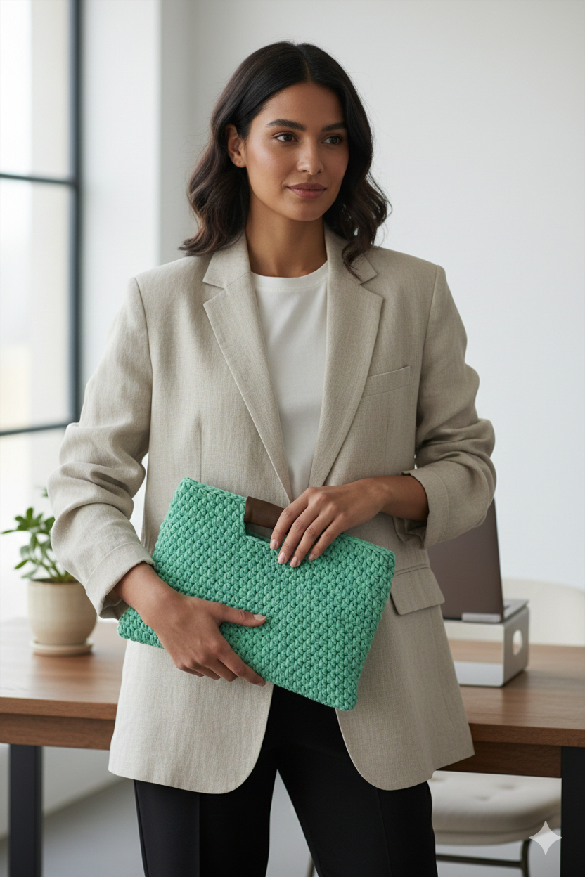 El emeğiyle örülmüş bu özel bilgisayar çantası, doğal dokusu ve zarif görünümüyle her kombine sofistike bir hava katar.