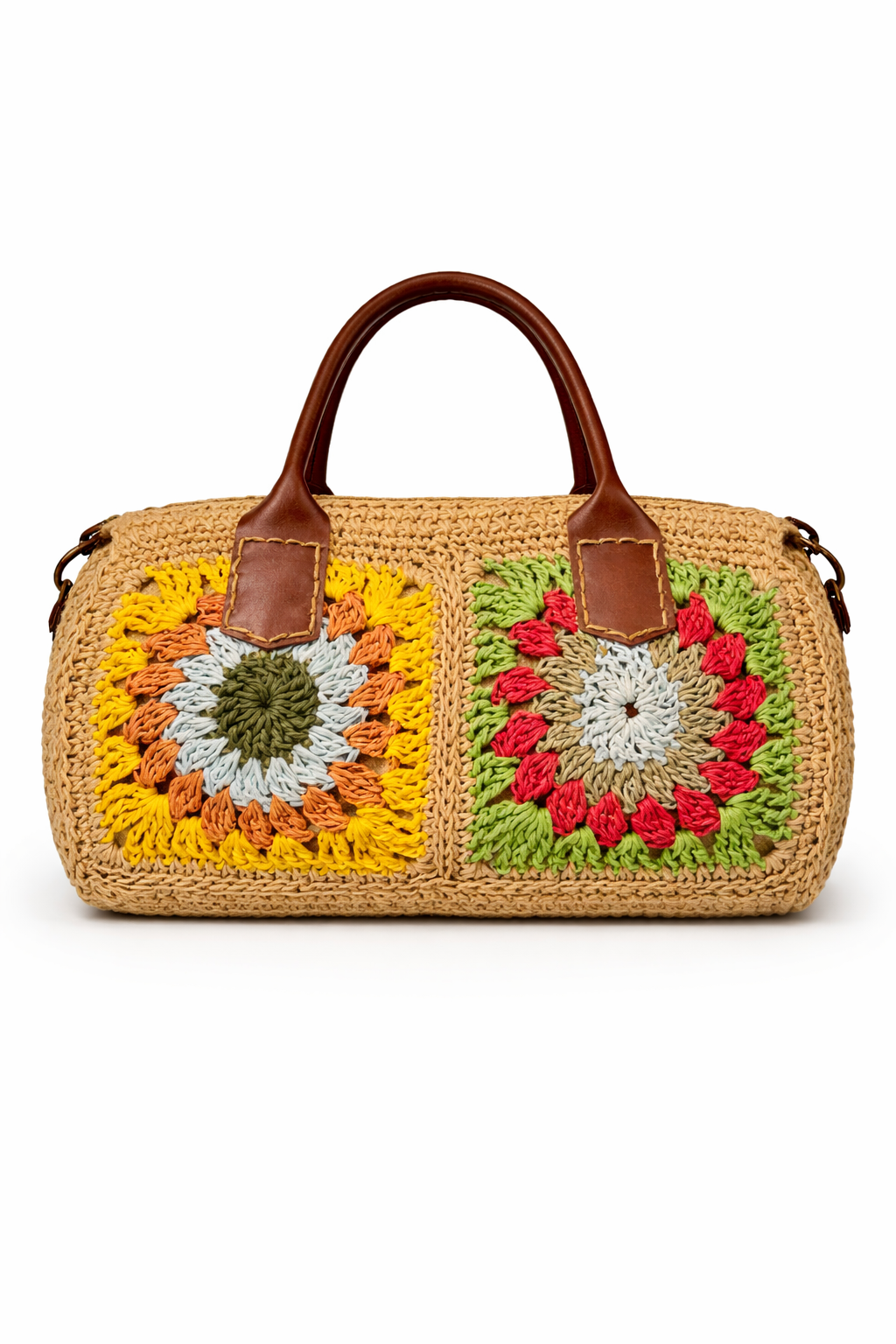Doğadan ilham alan çiçek motifleri ve el örgüsü detaylarıyla öne çıkan bu silindir form çanta, özgün ve enerjik bir stil sunar. Deri sapları ile şıklık ve dayanıklılığı bir araya getirirken, kompakt ama kullanışlı yapısı sayesinde günlük kullanım için ideal bir alternatiftir. Renkli motifleri sayesinde sade kombinlere canlılık katar.