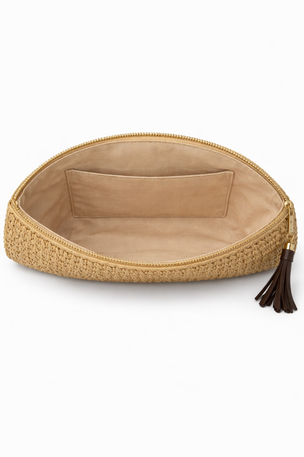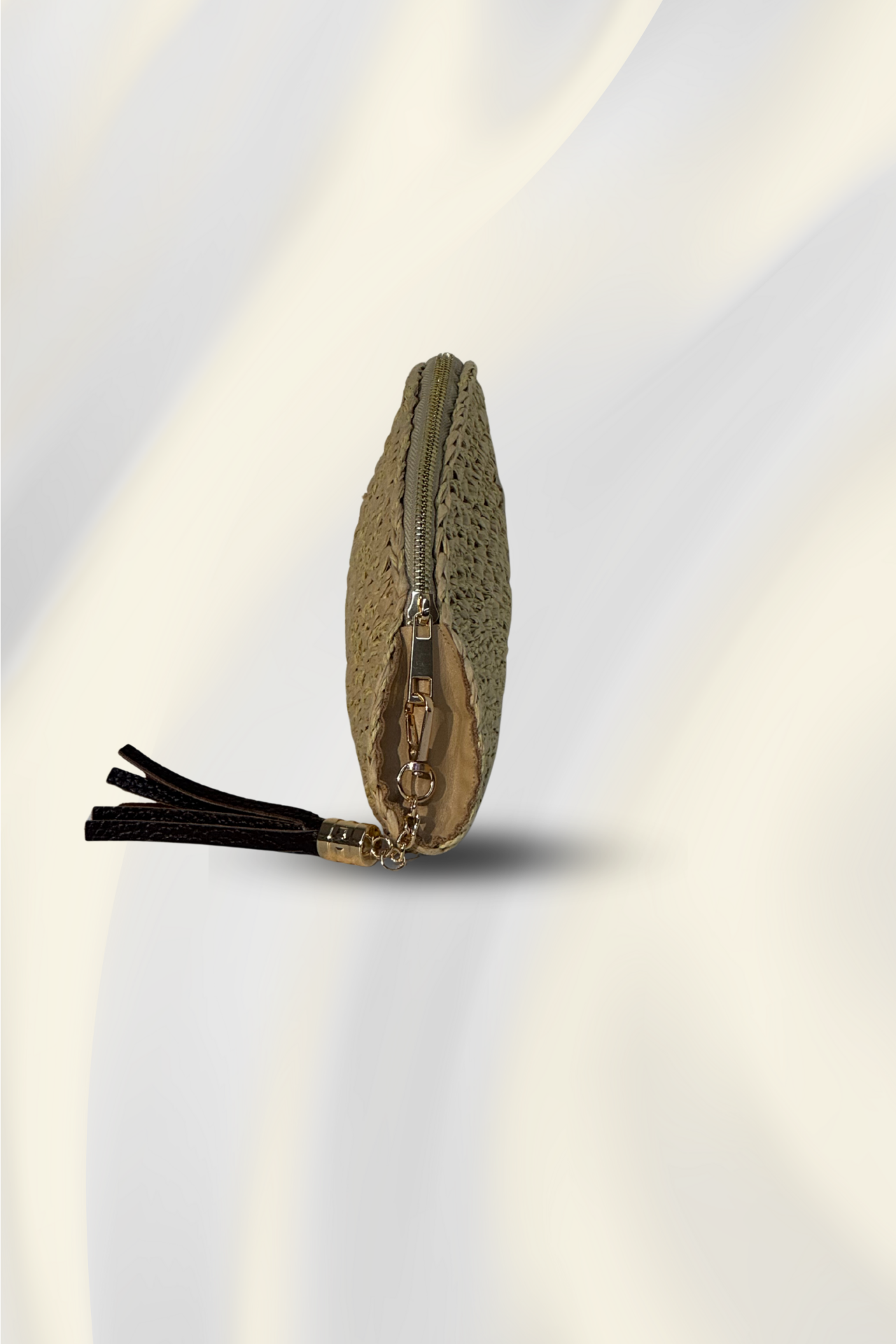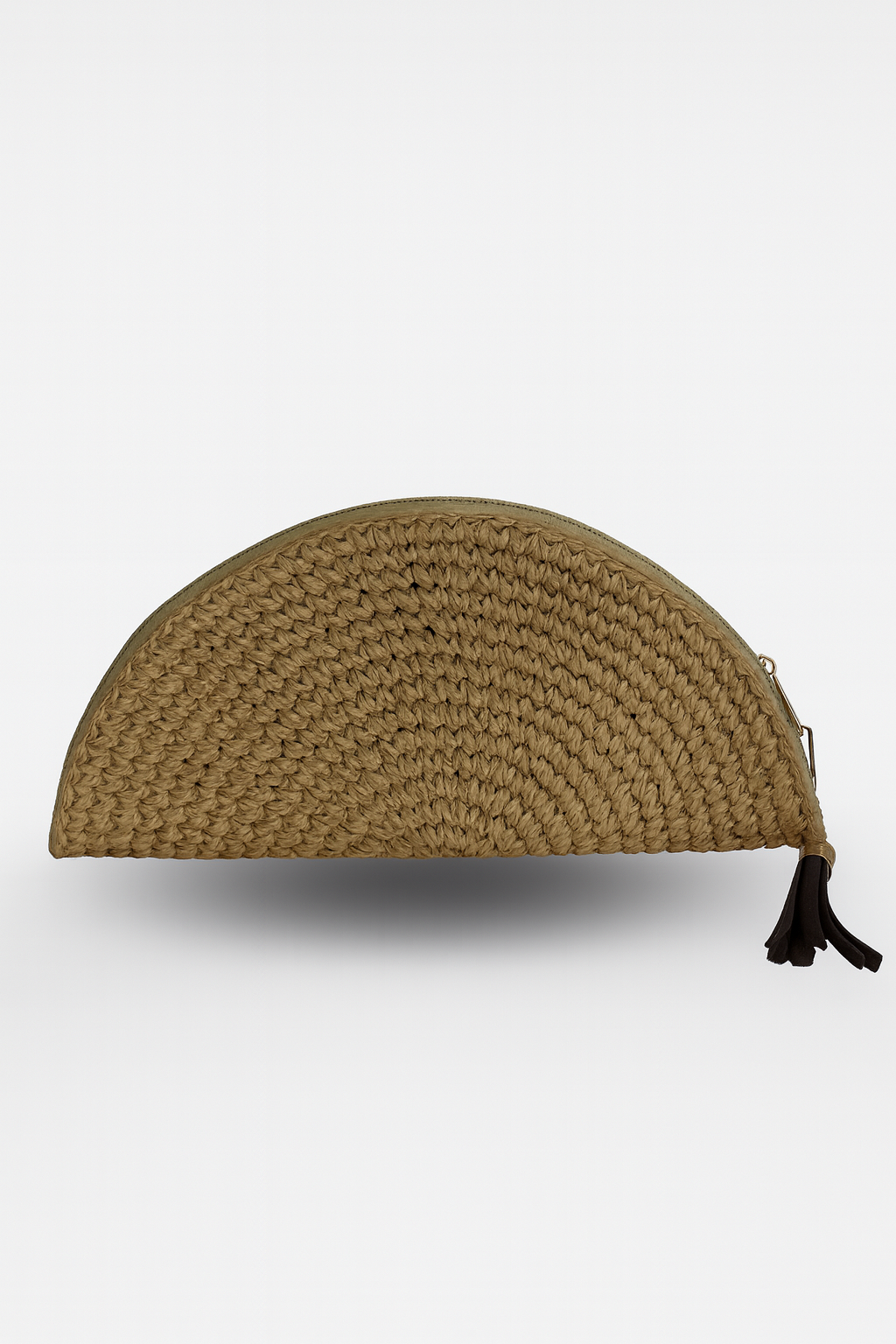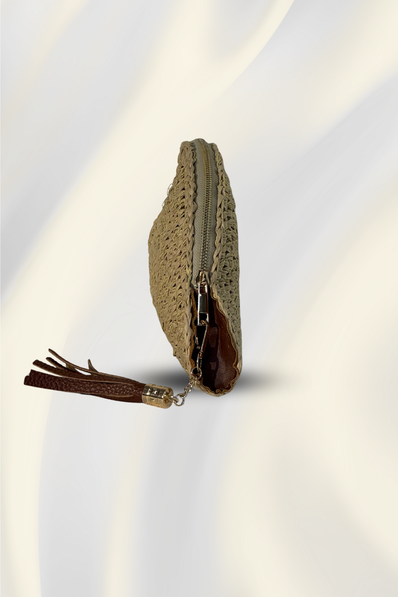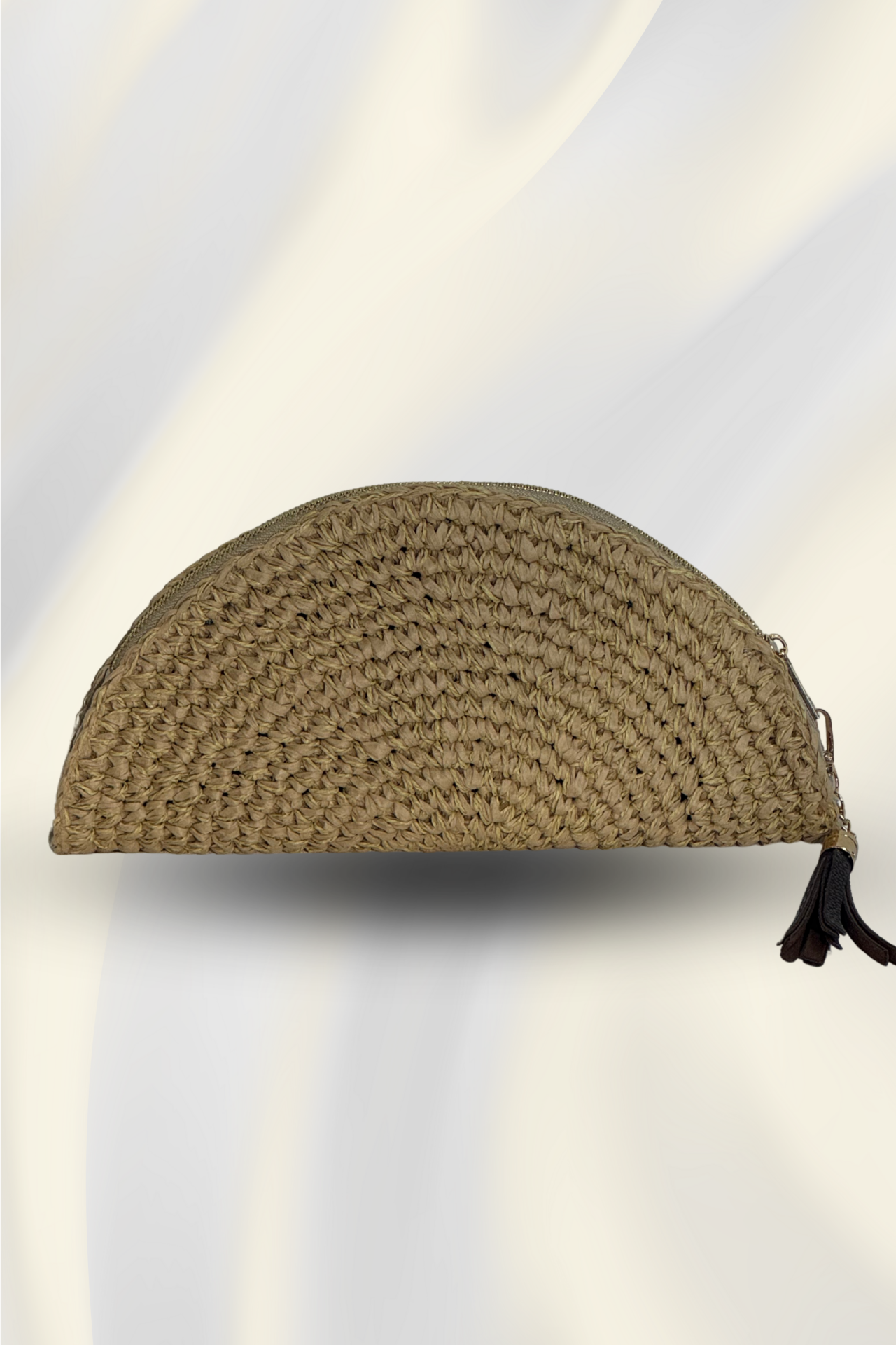Doğal Hasır Clutch, el işçiliğiyle örülmüş zarif dokusu ve yarım ay formuyla doğallığın en şık halini sunar. Minimal tasarımı, iç astarı ve püskül detayıyla hem gündüz hem gece kombinlerinizde stil sahibi bir tamamlayıcıdır.