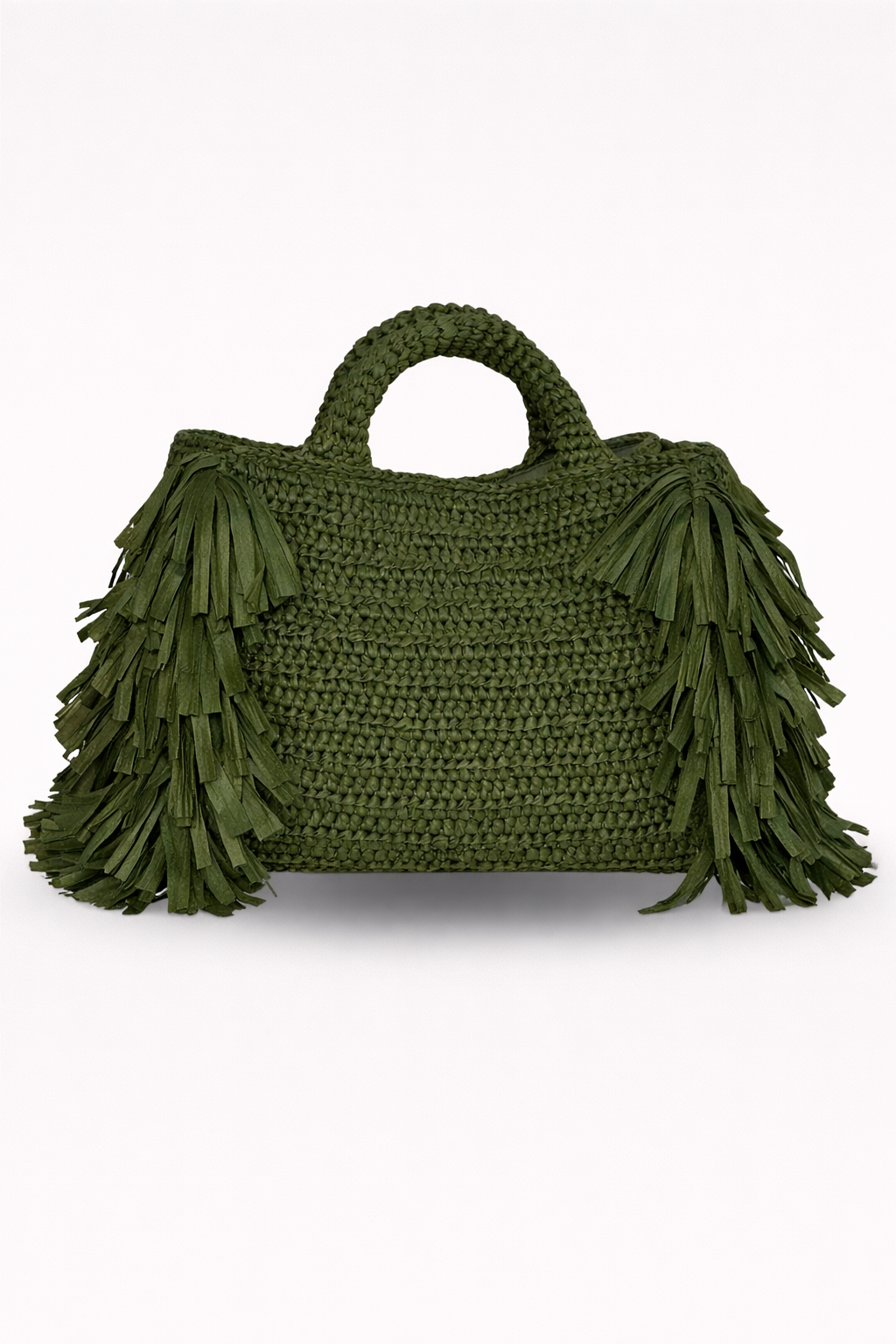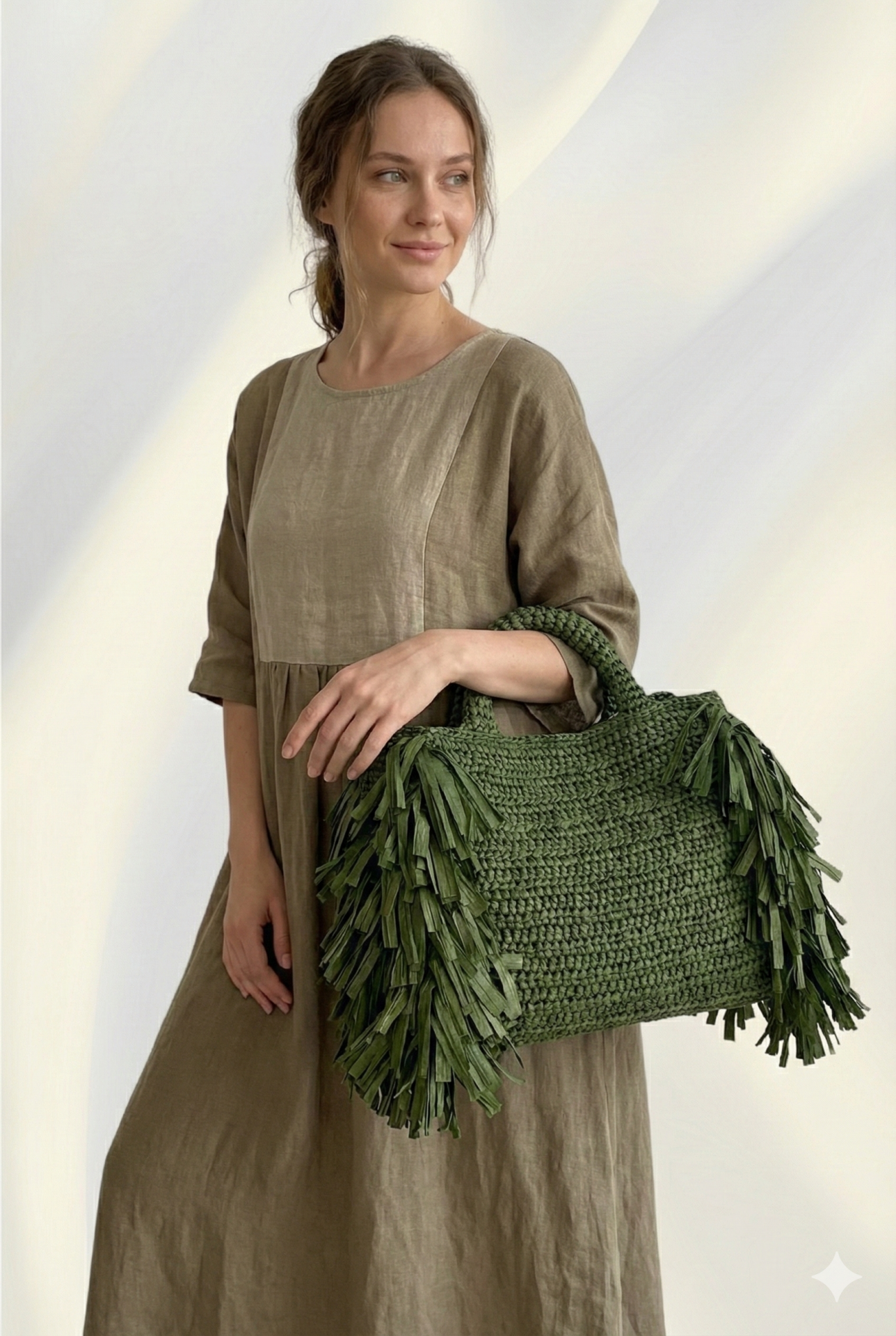 Kanatlı Püskül Çanta Koleksiyonu, yanlarda yer alan püskülleriyle kanat formunu andıran özgün bir tasarıma sahiptir. Kağıt ipin doğal dokusuyla birleşen bu model, hem günlük hayatta hem de plajda rahatlıkla kullanılabilecek hafif ve şık bir çantadır. Modern çizgileri ve zarif detaylarıyla her kombine uyum sağlar, doğallığıyla stilinize özgün bir hava katar.