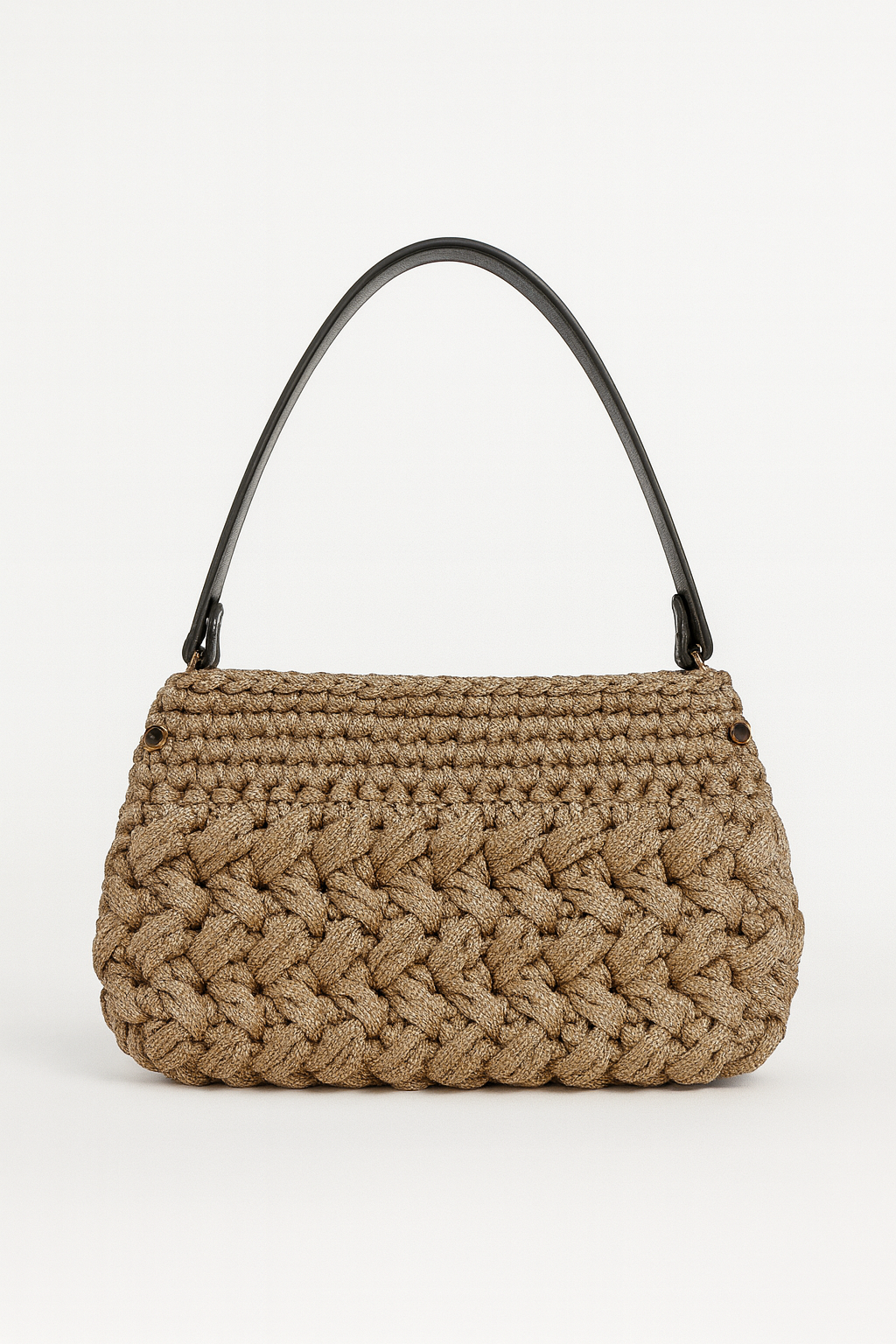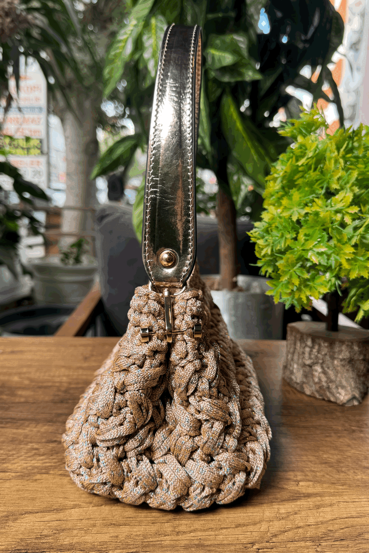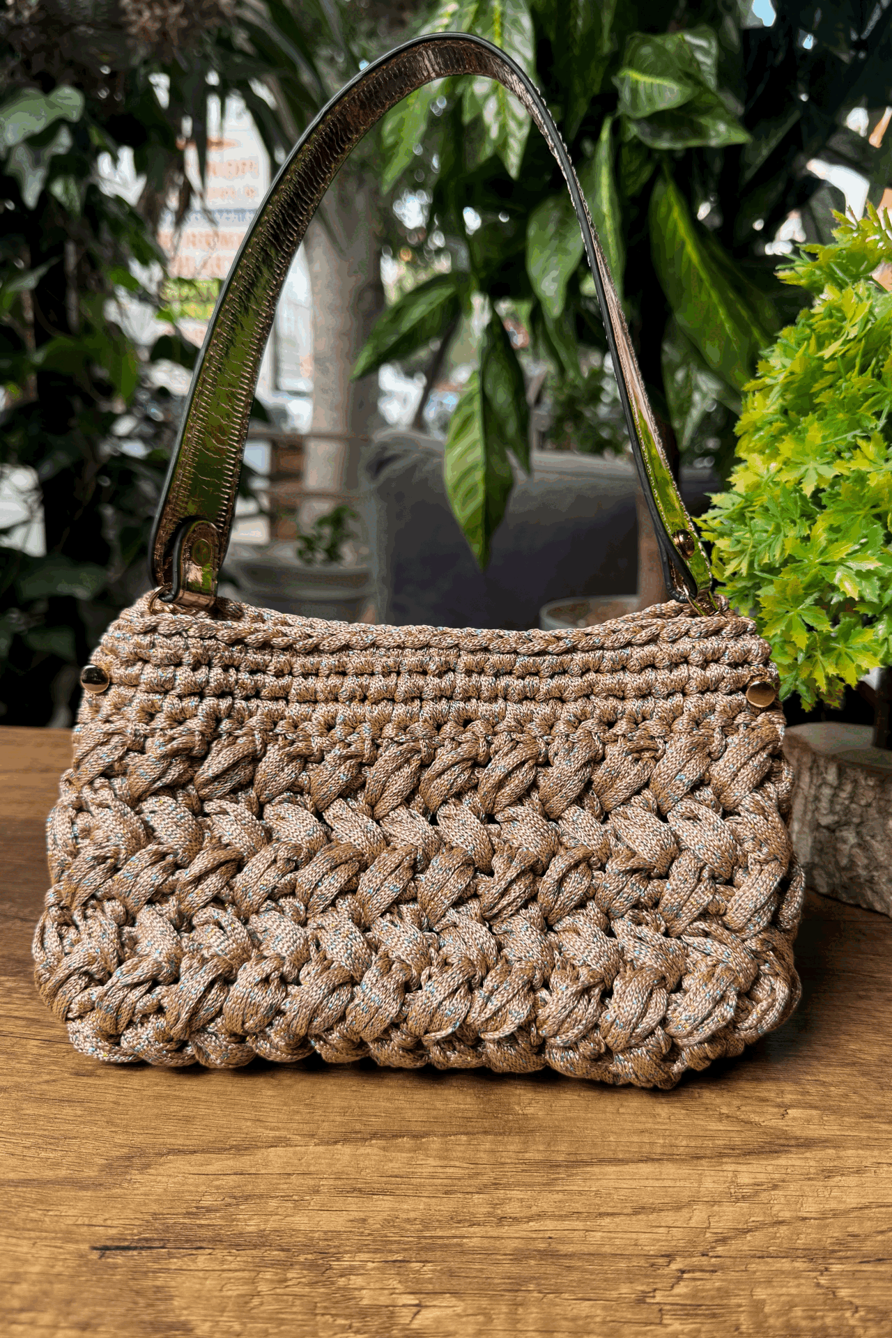 Derin tonlarıyla dikkat çeken bu el yapımı gece çantası, modern örgü dokusu ve parlak ip detaylarıyla zarafeti yeniden tanımlar. Minimal tasarımıyla sade şıklığı sevenler için ideal, hem zarif akşam davetlerinde hem şehir ışıkları altında stilinizi tamamlayacak özgün bir parça.