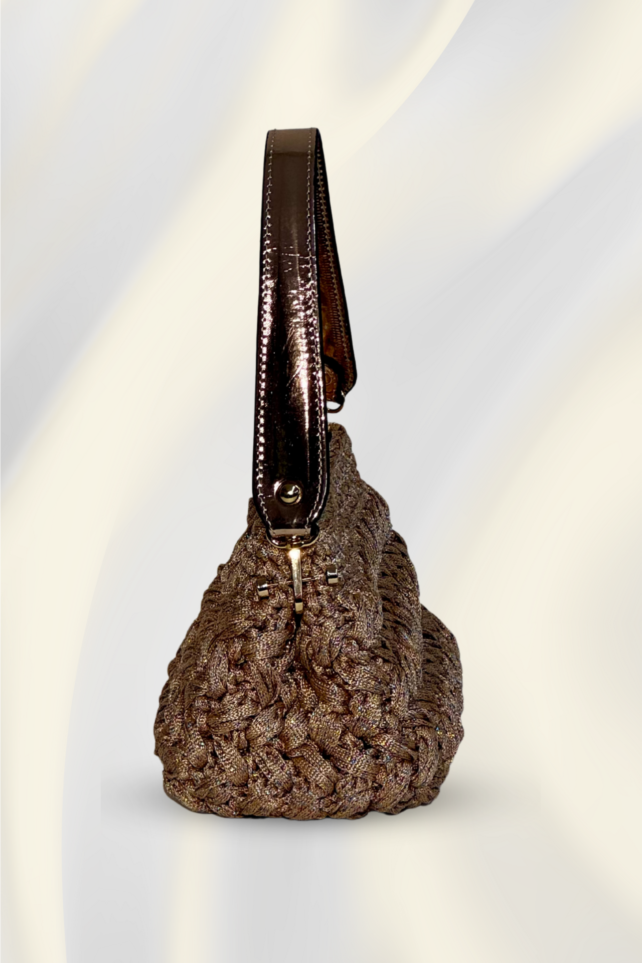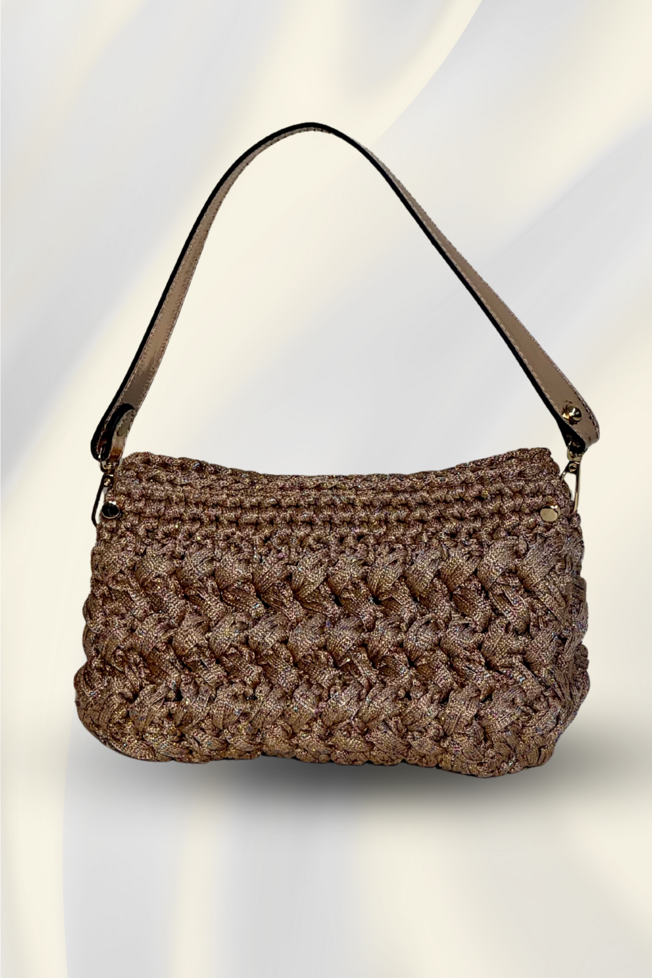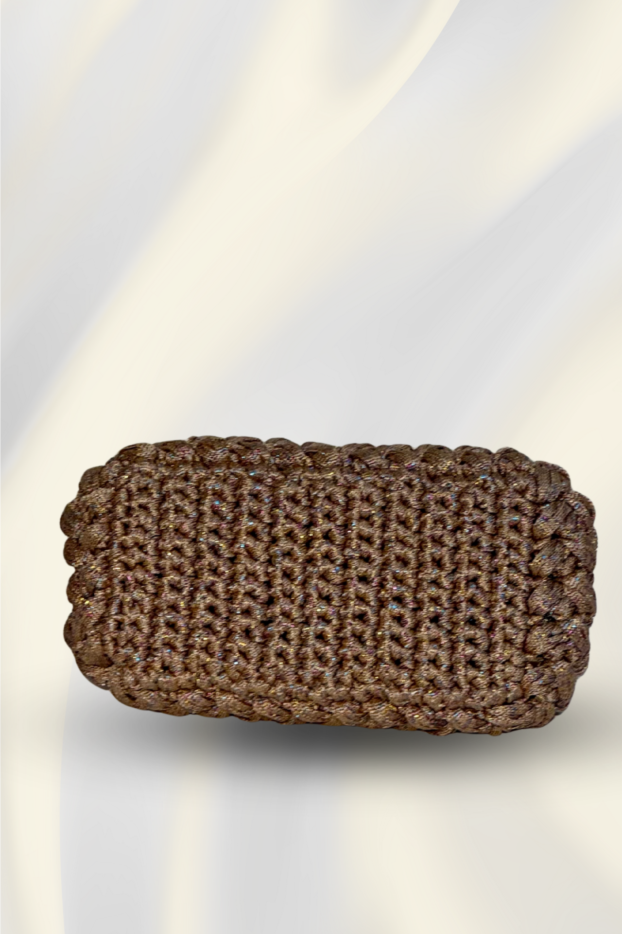 Derin tonlarıyla dikkat çeken bu el yapımı gece çantası, modern örgü dokusu ve parlak ip detaylarıyla zarafeti yeniden tanımlar. Minimal tasarımıyla sade şıklığı sevenler için ideal, hem zarif akşam davetlerinde hem şehir ışıkları altında stilinizi tamamlayacak özgün bir parça.