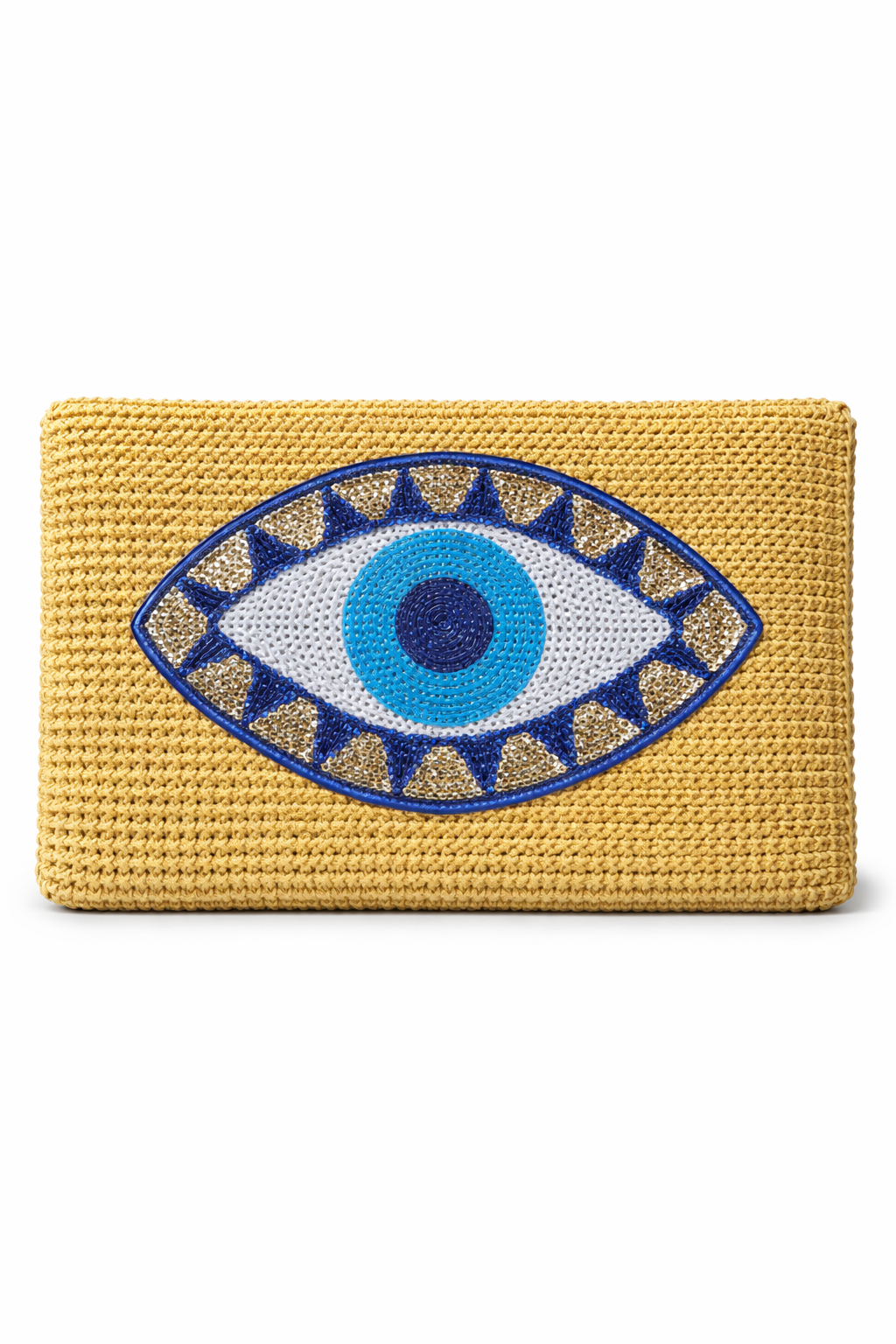 El emeği örgü dokusu üzerine işlenen nazar gözü motifiyle öne çıkan bu clutch çanta, geleneksel sembolleri modern tasarımla buluşturur. Sade formu ve dikkat çekici merkezi detayı sayesinde hem günlük kombinlerde hem de özel davetlerde stilinizi tamamlayan güçlü bir aksesuar sunar. Doğal dokusu ve özgün işçiliğiyle zamansız bir şıklık yaratır.