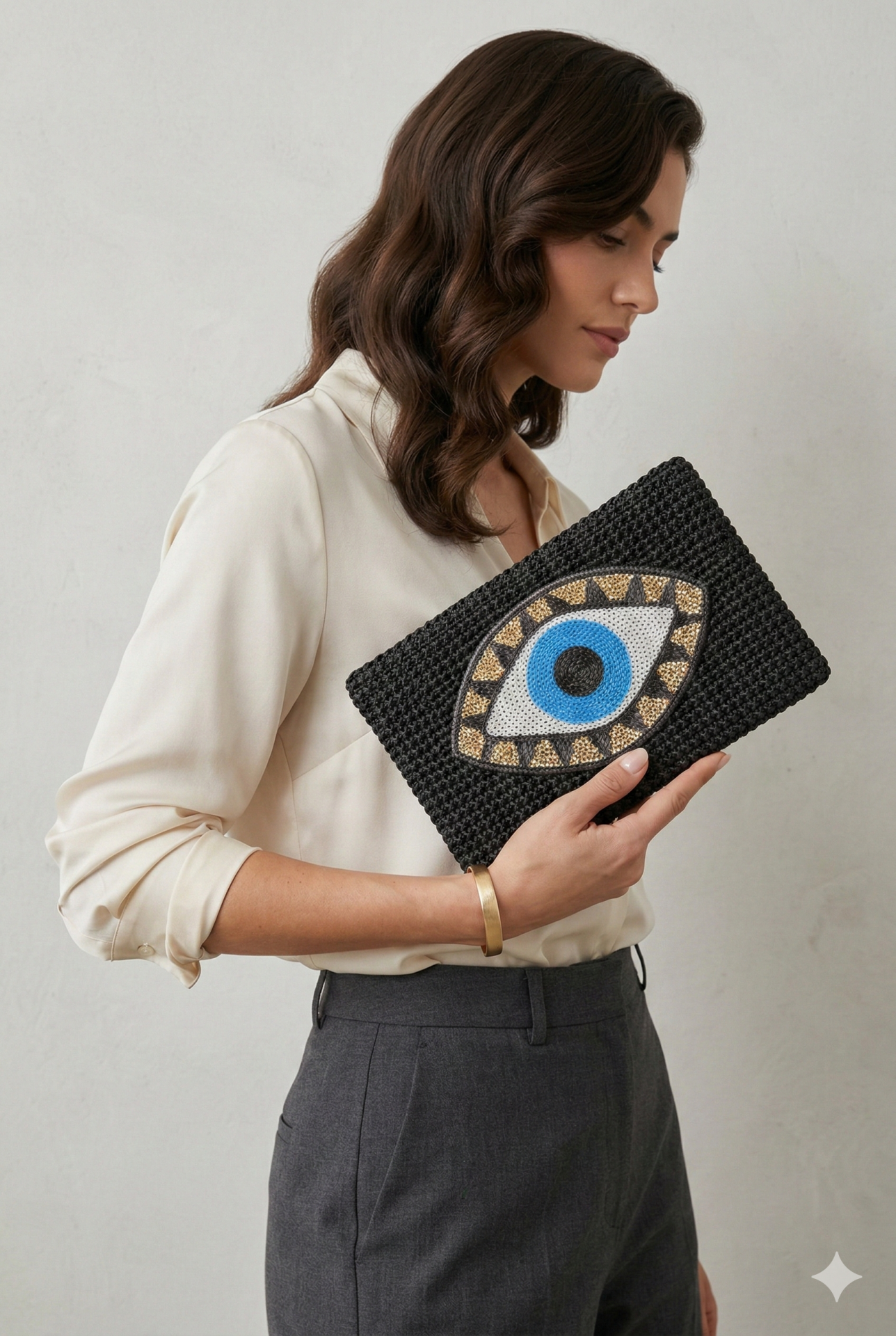 El emeği örgü dokusu üzerine işlenen nazar gözü motifiyle öne çıkan bu clutch çanta, geleneksel sembolleri modern tasarımla buluşturur. Sade formu ve dikkat çekici merkezi detayı sayesinde hem günlük kombinlerde hem de özel davetlerde stilinizi tamamlayan güçlü bir aksesuar sunar. Doğal dokusu ve özgün işçiliğiyle zamansız bir şıklık yaratır.
