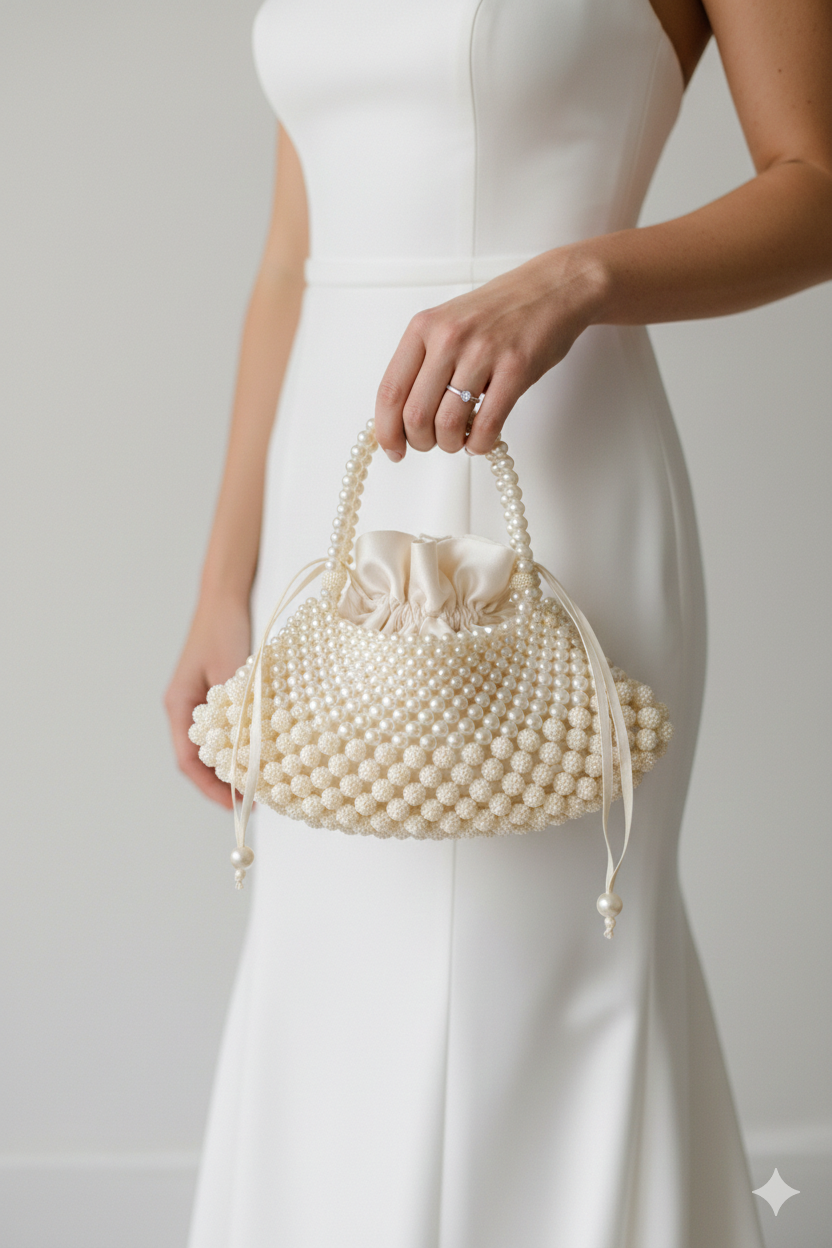 Düğün serisi için özel olarak tasarlanan Pearl Blossom Wedding Serisi, inci detaylarının romantik ışıltısını zarif formlarla buluşturur. Tamamı inci işçiliğiyle hazırlanan bu özel çantalar, gelinliğin zarafetini tamamlayan şık bir aksesuar olmanın ötesinde, davetlerden özel gecelere uzanan zamansız bir stil sunar. Klasik ve modern çizgilerin dengeli birleşimiyle, her model sofistike bir duruş sergiler.