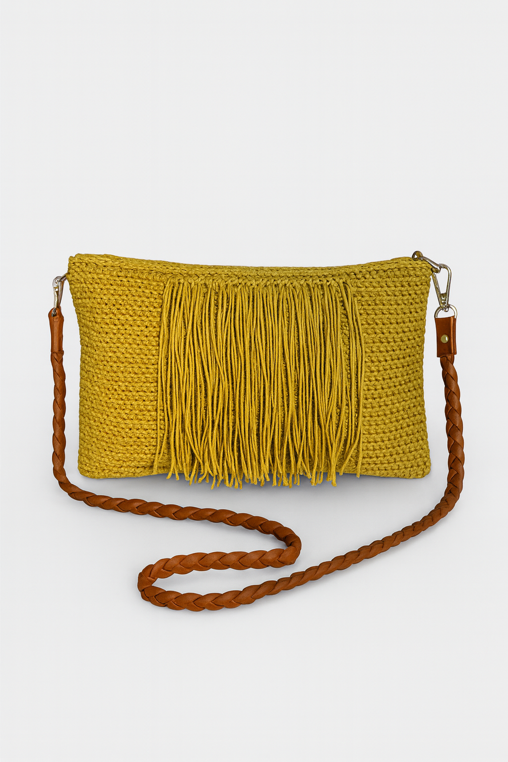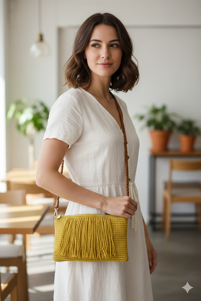 Püskül detaylı bu el yapımı çanta, bohem ruhu modern çizgilerle buluşturur. Zeytin yeşili tonuyla doğadan ilham alır, örgü dokusu ve deri örgü askısı ile sade ama iddialı bir stil yaratır. Hem gündüz hem akşam kombinlerinde fark yaratmak isteyenler için zamansız bir tamamlayıcıdır.