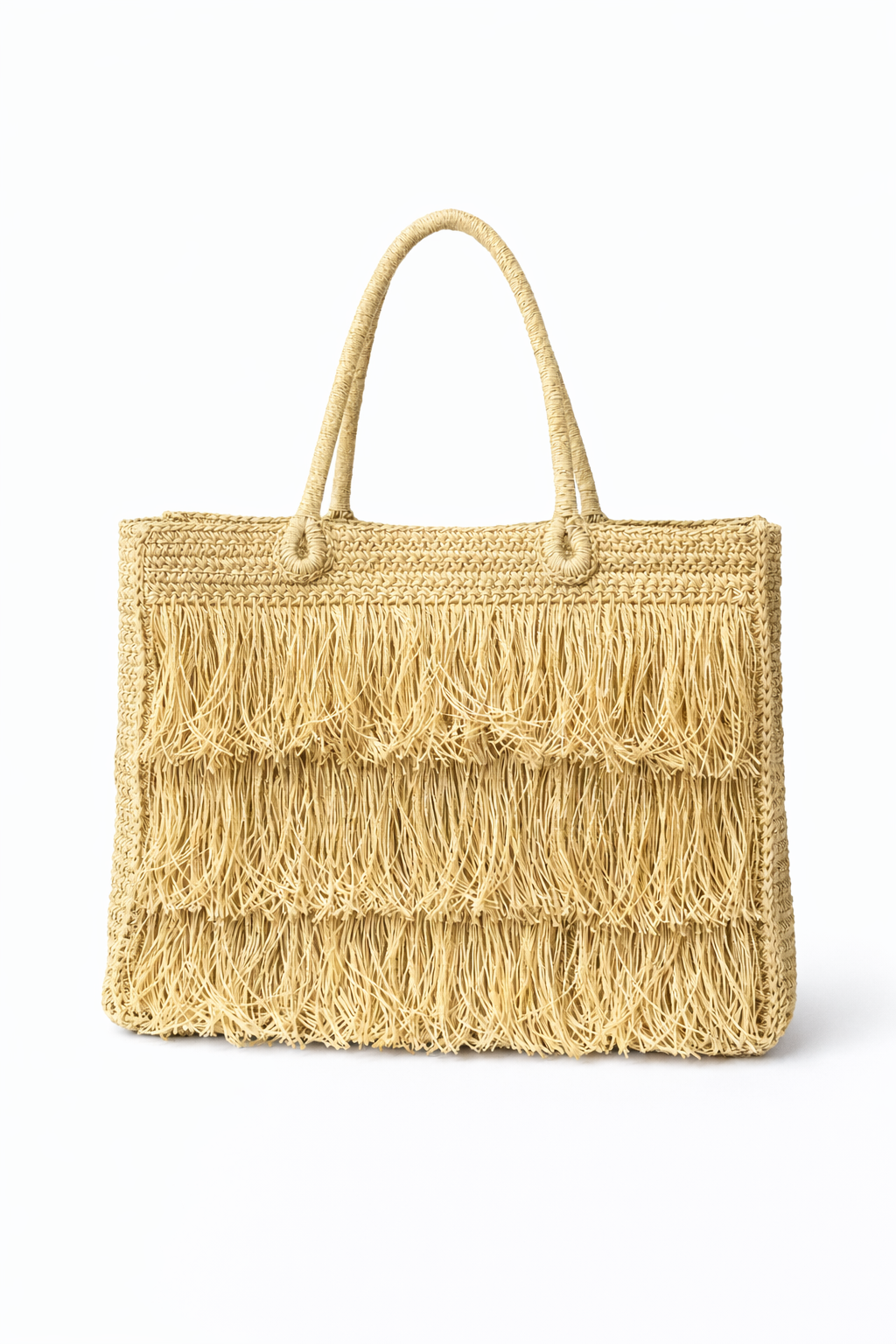 Katmanlı püskül detaylarıyla öne çıkan bu büyük tote çanta, el örgüsünün doğal dokusunu modern bir silüetle buluşturur. Geniş iç hacmi sayesinde günlük kullanımdan tatil kombinlerine kadar fonksiyonel bir şıklık sunar. Güçlü sap yapısı ve formunu koruyan gövdesiyle hem rahat hem iddialı bir stil tamamlayıcısıdır.