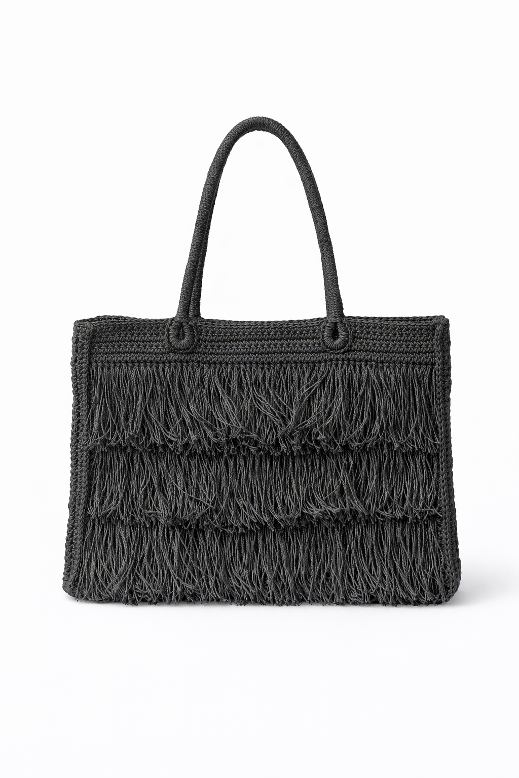 Püsküllü El Örgüsü Büyük Tote Çanta – Doğal Dokunun Güçlü İfadesi - Siyah