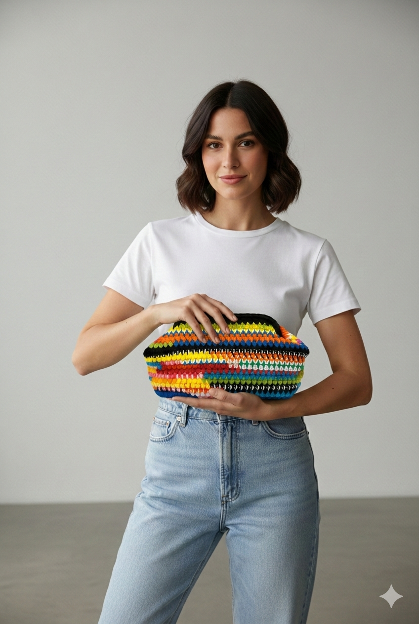 Renk Bahçesi Clutch, el emeği örgü detayları ve canlı tonların uyumuyla pozitif enerjiyi stilinize taşır. Her bir rengiyle el işçiliğinin sıcaklığını yansıtan bu çanta, günlük kullanımdan özel davetlere kadar her ana uyum sağlar. Kompakt formu sayesinde hem pratik hem de göz alıcı bir tamamlayıcıdır.