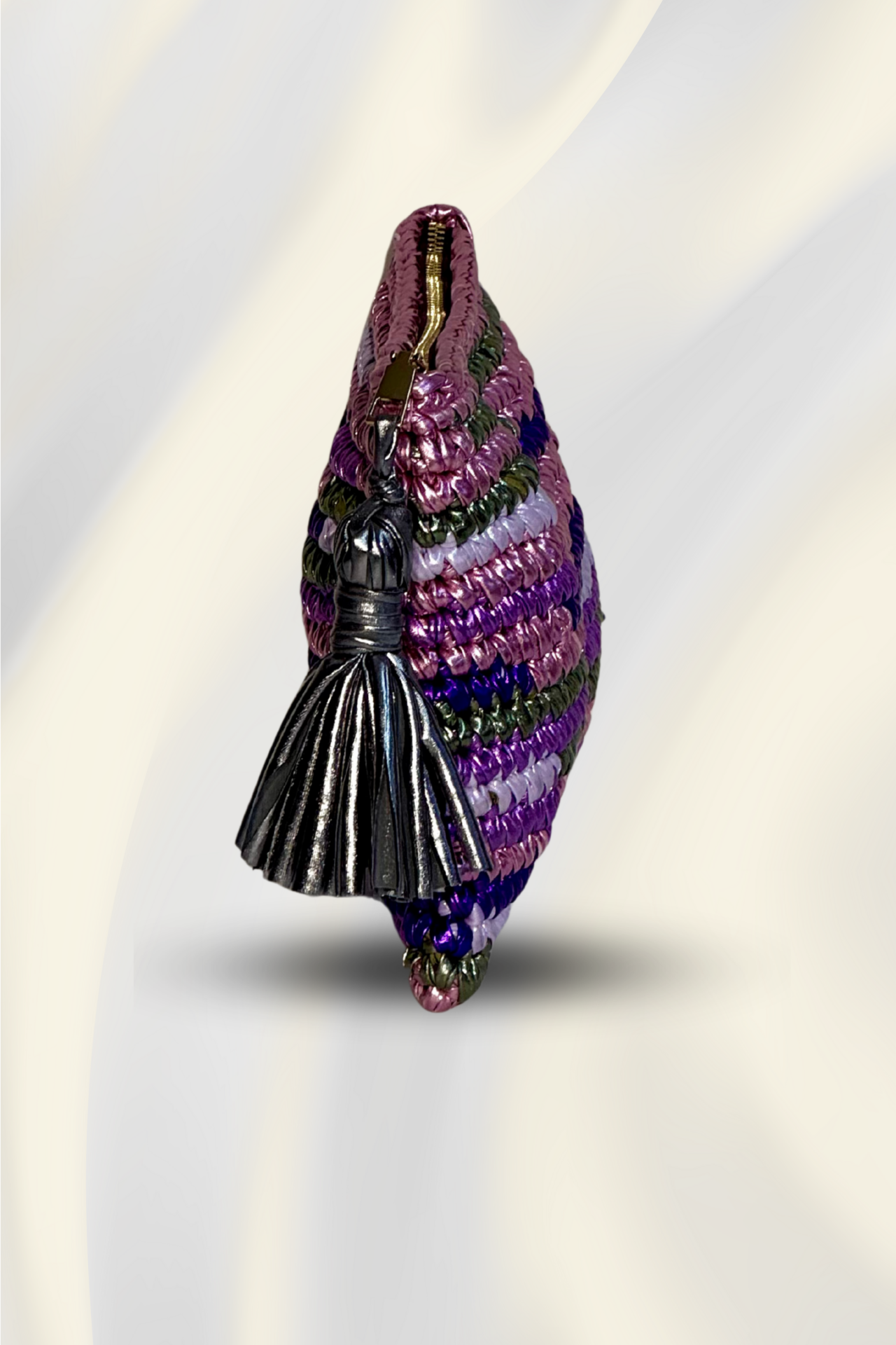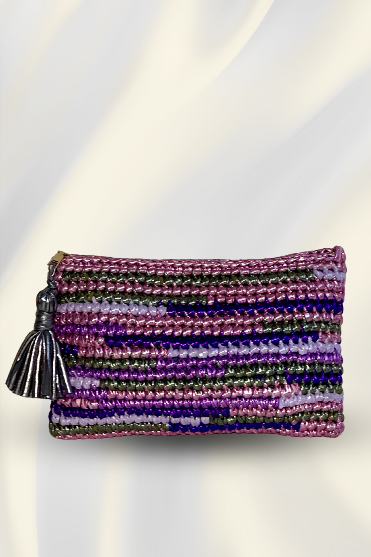 Renkli Çizgi Clutch, el emeği örgü dokusuyla modern ve dinamik bir görünüm sunar. Canlı renk geçişleri, parlak ip dokusu ve dikkat çekici püskül detayıyla her kombine hareket ve enerji katar. Günlük kullanımda pratik, özel günlerde ise özgün bir tarz tamamlayıcısıdır.