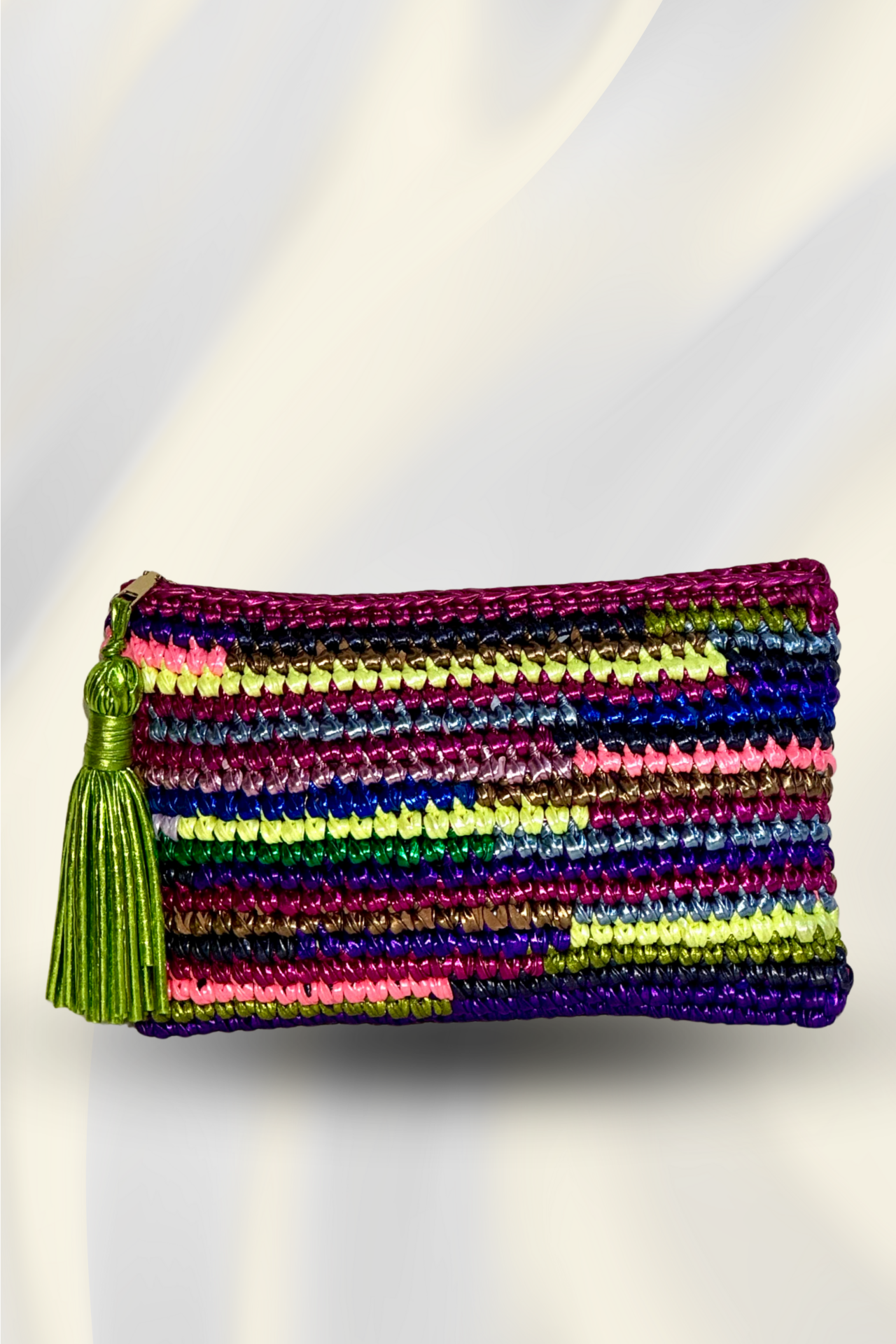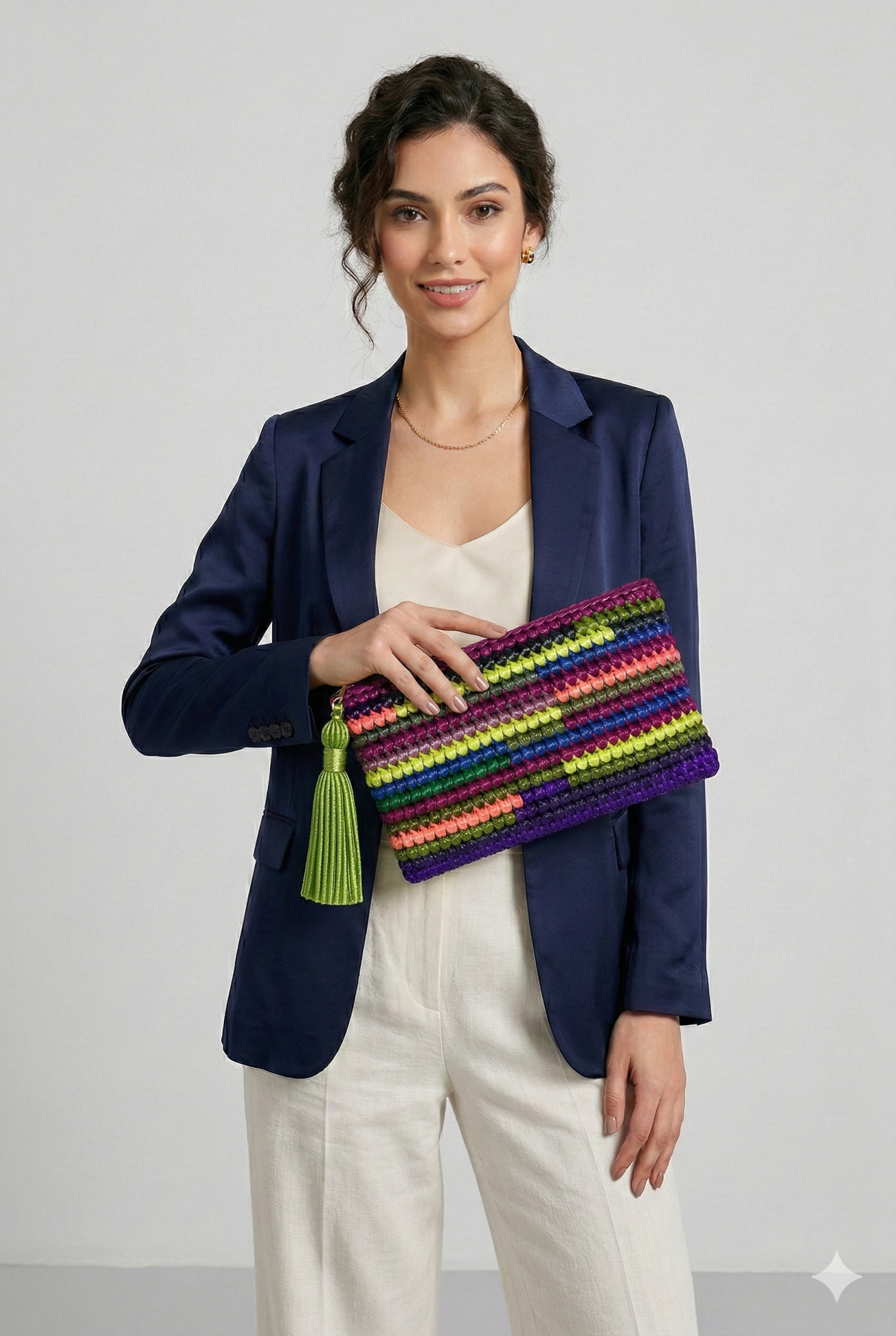 Renkli Çizgi Clutch, el emeği örgü dokusuyla modern ve dinamik bir görünüm sunar. Canlı renk geçişleri, parlak ip dokusu ve dikkat çekici püskül detayıyla her kombine hareket ve enerji katar. Günlük kullanımda pratik, özel günlerde ise özgün bir tarz tamamlayıcısıdır.