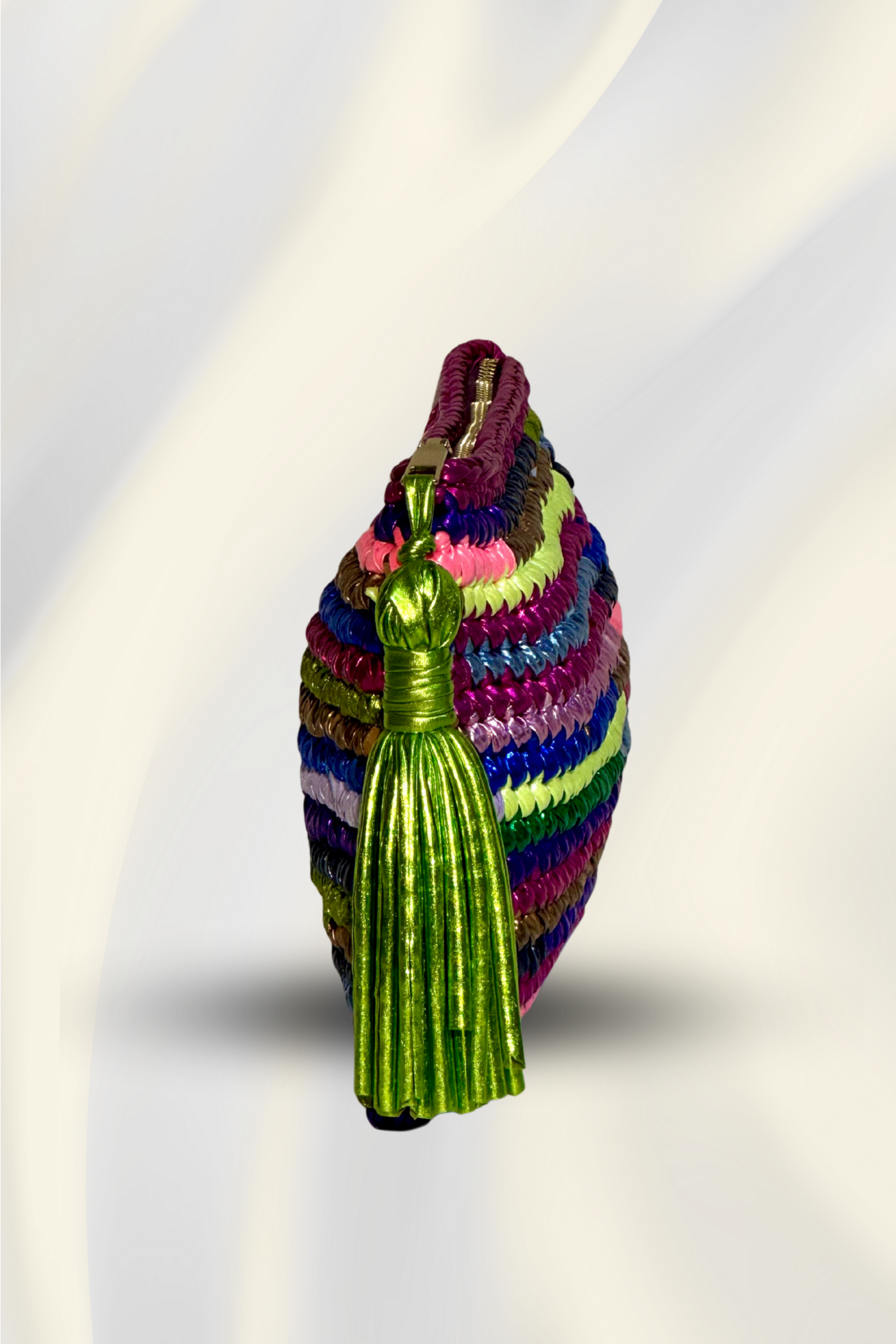 Renkli Çizgi Clutch – Enerjik ve Cesur Stil Dokunuşu - Fıstık Yeşili Püskül
